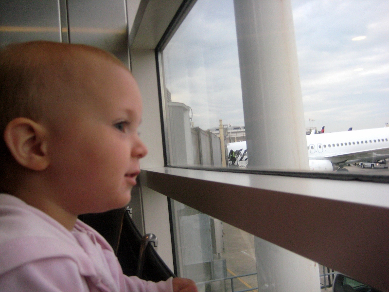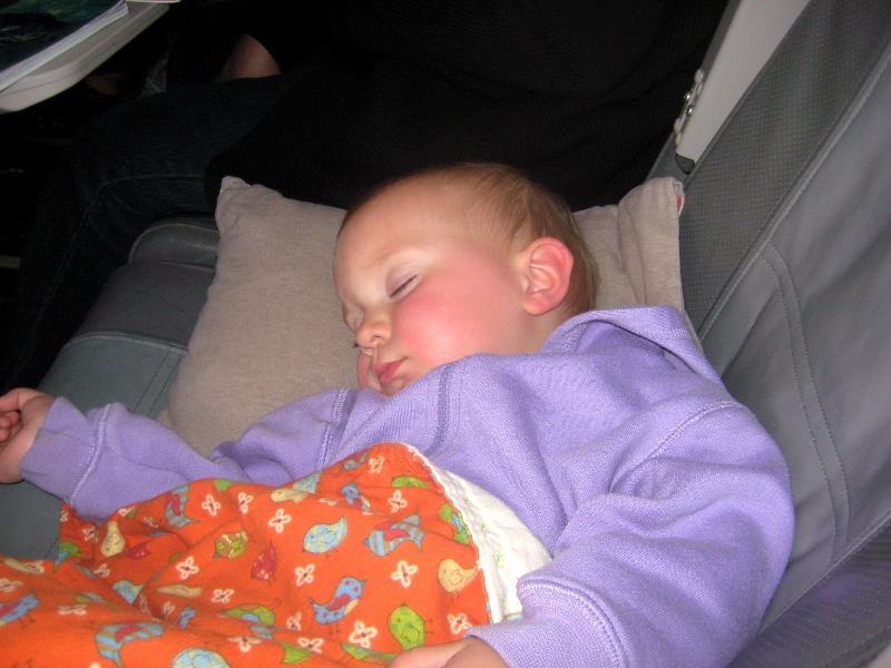 Ellie, fast asleep on our first flight (and the only flight with an extra seat)